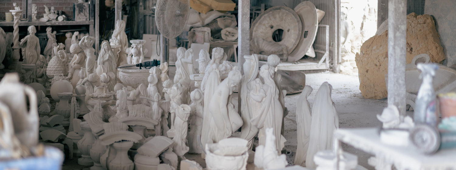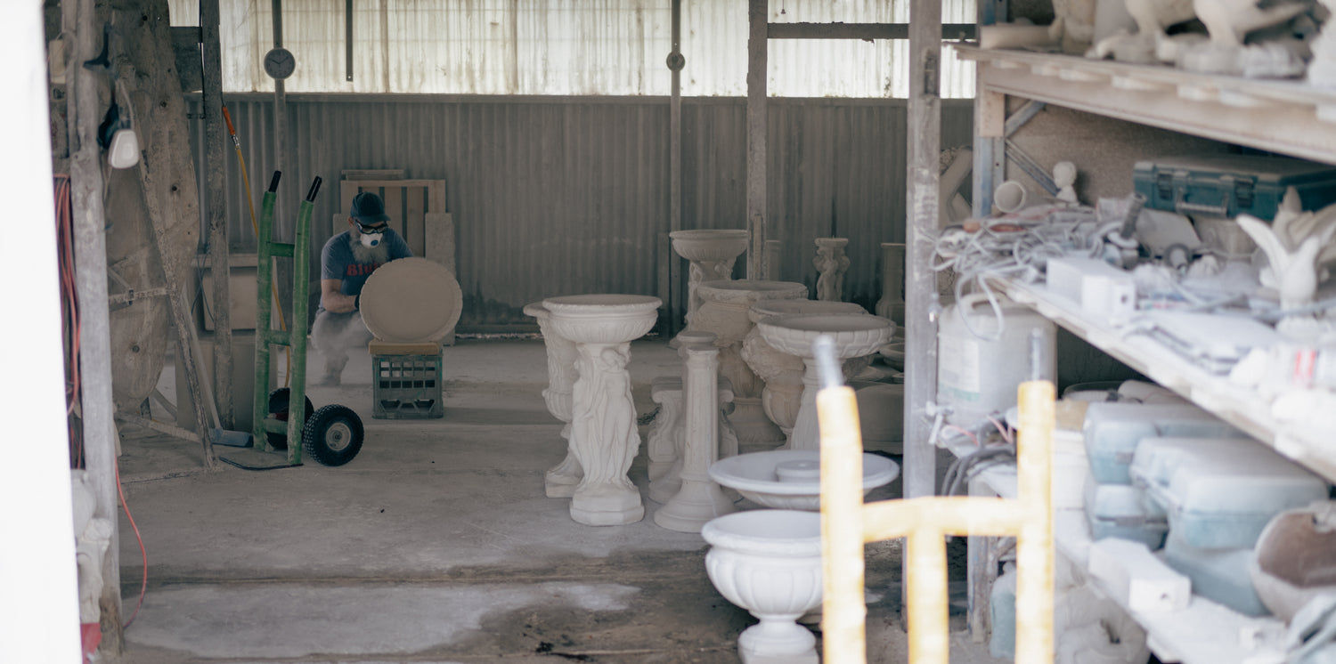 We use a blend of reconstituted limestone and white cement sourced from local Australian suppliers to create all of our fountains, statues and garden decor.